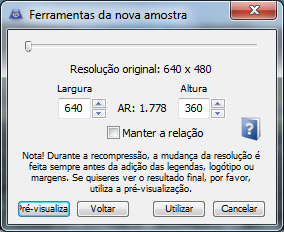 No quadro seguinte((fig.4) altere, somente através dos botões, as dimensões desejadas. No nosso caso partindo dum original com largura de 640 e altura de 480 (RA relação de aspecto 4x3) e como pretendemos, mantendo a mesma largura, obter um 16x9, teremos de dividir a largura por 16 e multiplicar por nove. Ou seja 640:16x9=360. Pode visualizar clicando em "Pré-visualizar". Se tudo está como deseja clique em "Aplicar"