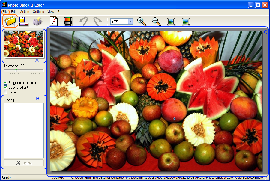 A = Imagem Foto Original; B = Cores ou gradientes seleccionados e C= Área de trabalho.