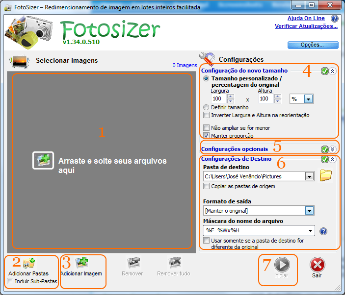Bom em primeiro lugar há que aceder ao site do Fotosizer para poder baixá-lo. Clique em Fotosizer para aceder. Depois é só instalar no seu pc. Uma vez instalado clique no ícone do programa no seu ambiente de trabalho para o iniciar e verá a sua interface similar à imagem ao lado. Se por algum acaso a instalação não ficou no seu idioma saiba que basta clicar no botão de opções e aí fazer a sua selecção. Vamos agora analisar a interface deste excelente programa.