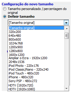 Nesta área também pode converter as suas imagens para outro formato. Esta opção pode ser efectuada em conjunto com a alteração do tamanho (2º Passo) ou isoladamente bastando para tal que escolha "Tamanho Original" na mesma área. Estão disponíveis diversos formatos de saída como se ilustra na seguinte imagem.