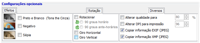 Neste espaço existe algumas opções básicas interessantes apara os mais desprevenidos ou para uma impressão mais barata (e de menor qualidade). Existem 3 efeitos de cor, possibilidade de rodar ou outras. Não se esqueça que irá aplicá-las a todas as imagens da área de trabalho.