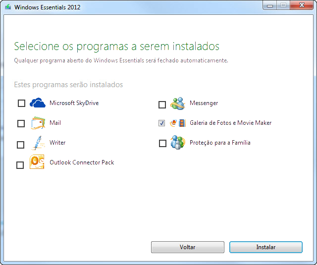 - Quando terminar a preparação da instalação aparecerá uma janela de diálogo, similar à imagem à direita. SELECCIONE SOMENTE OS PROGRAMAS DESEJADOS.