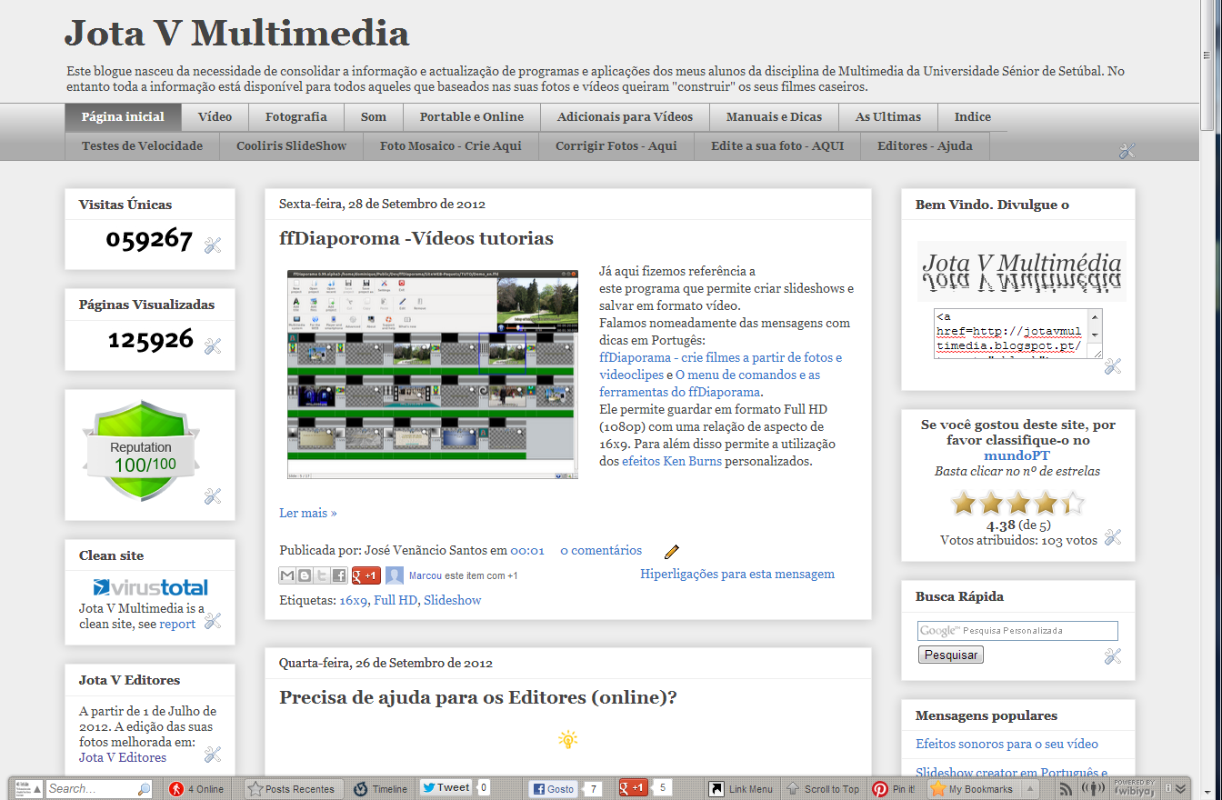 Este blogue nasceu da necessidade de consolidar a informação e actualização de programas e aplicações dos meus alunos da disciplina de Multimedia da Universidade Sénior de Setúbal. No entanto toda a informação está disponível para todos aqueles que baseados nas suas fotos e vídeos queiram "construir" os seus filmes caseiros.